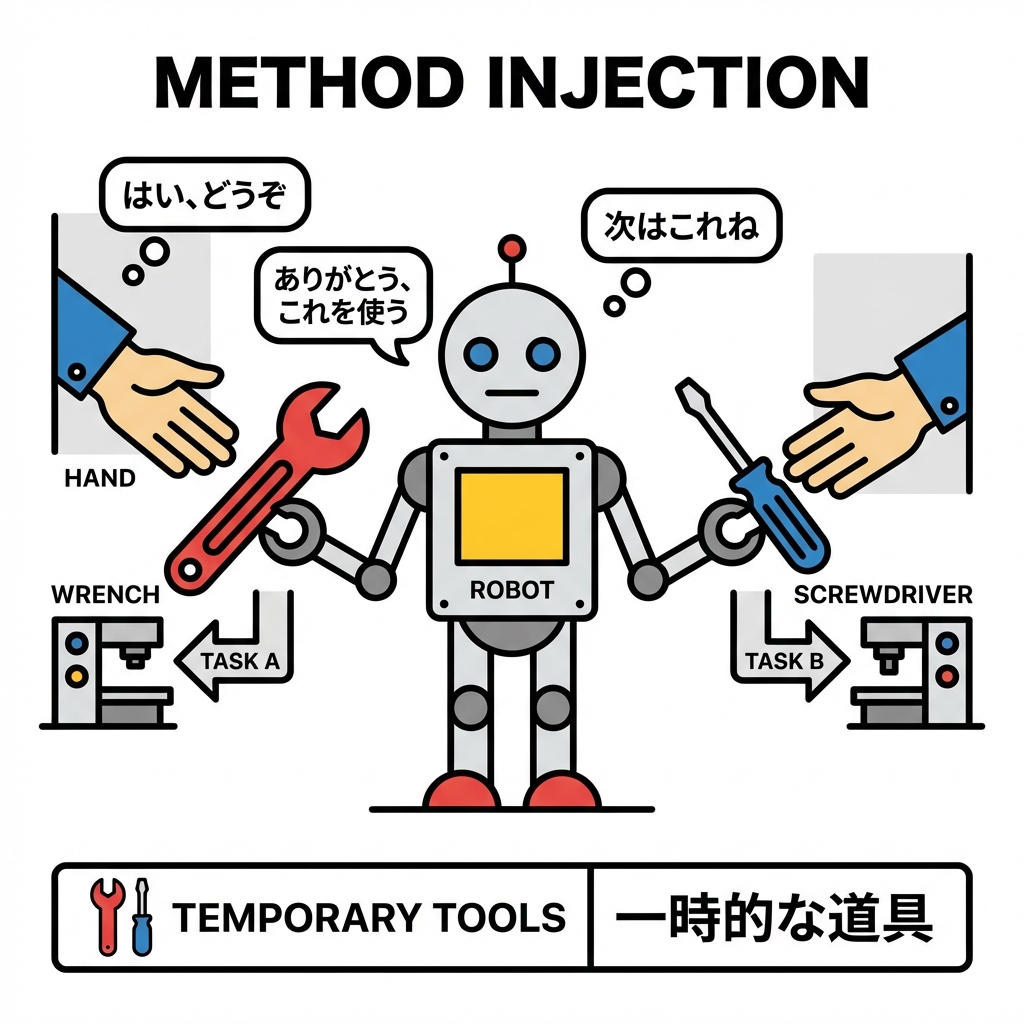 - 「その時だけ必要 / 呼び出し側が選ぶ」 → メソッド注入🧤