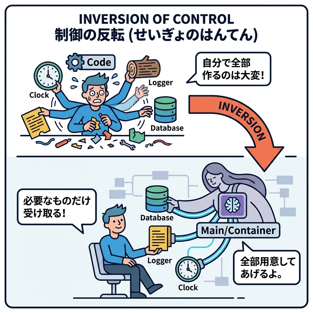 - ❌ 内側のコードが全部決める: 「私はログも時計も自分で作る!自分で選ぶ!自分で呼ぶ!」😤