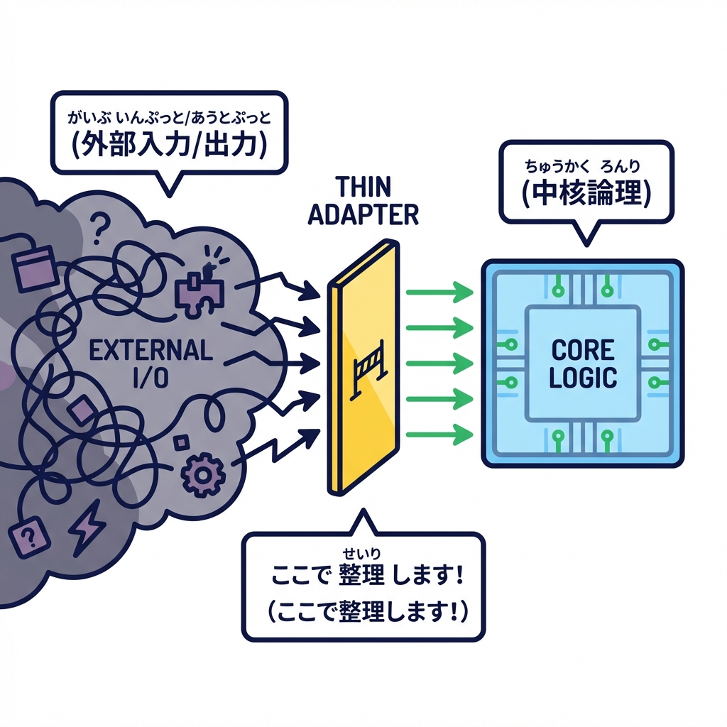 • I/Oを アダプタ(adapter) に包んで、ロジックから分離できる✂️🧩