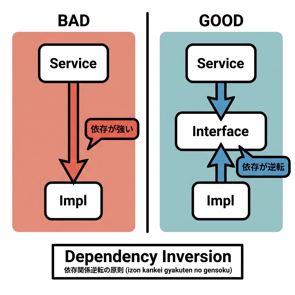 - コツは「上位も下位も抽象(interface)に依存する」🧩