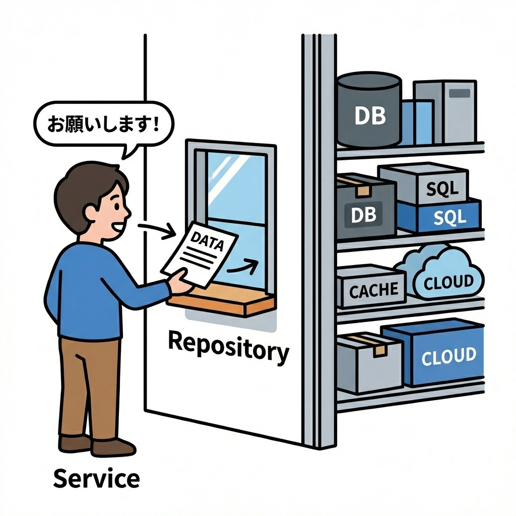 今日はね、「外の世界(DBとか)に触る部分」を、アプリの中心から追い出す練習をするよ〜!🚚💨 そのために使うのが Repository(リポジトリ) =「保存や取得の窓口(ポート)」だよ🚪🗄️