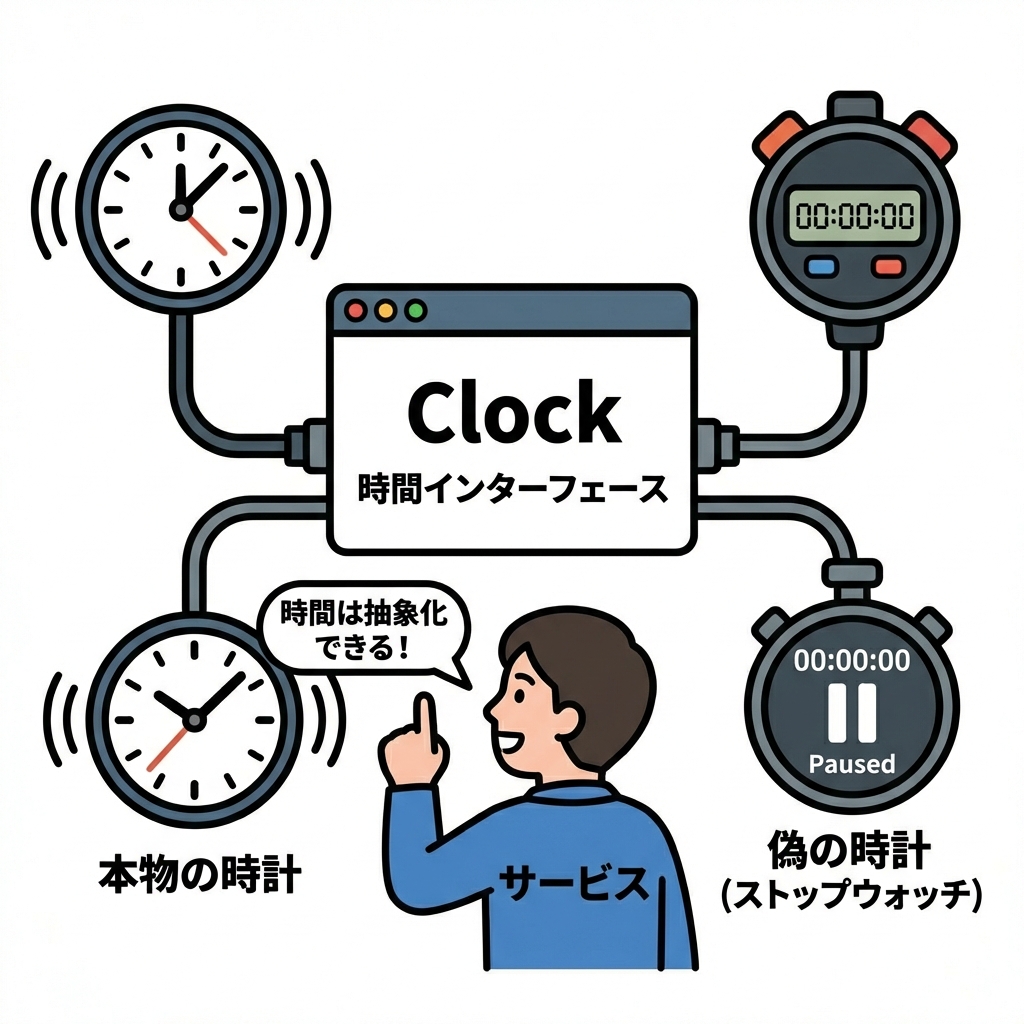 上位(業務)側が欲しいのは「今の時刻」 ✅ だから「今」を返す Clock interface を上位側に置く