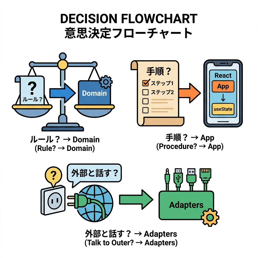 第5章 迷わない層モデル:Domain / Application / Adapters を決めよう🧅🗺️