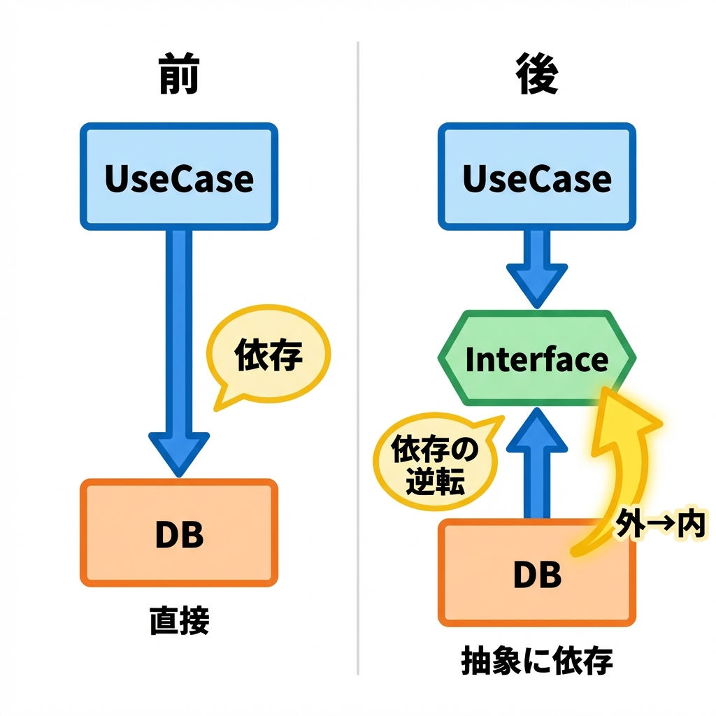• 外側(DB/HTTP) → 契約(interface)を実装