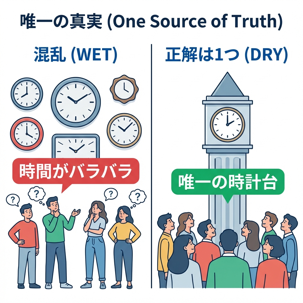 DRY = Don’t Repeat Yourself(繰り返すな)だけど、ここで言う“繰り返し”は 「同じコード」だけじゃなくて「同じルール(知識)」の繰り返しのことだよ〜😊✨