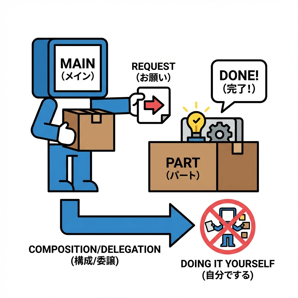 - ããã®ã¯ã©ã¹ã®è²¬åãåããŠã**éšåïŒinterfaceïŒ**ã«ããŠãå§è²ãã圢ã«ãªãã¡ã¯ã¿ããŠãð§©