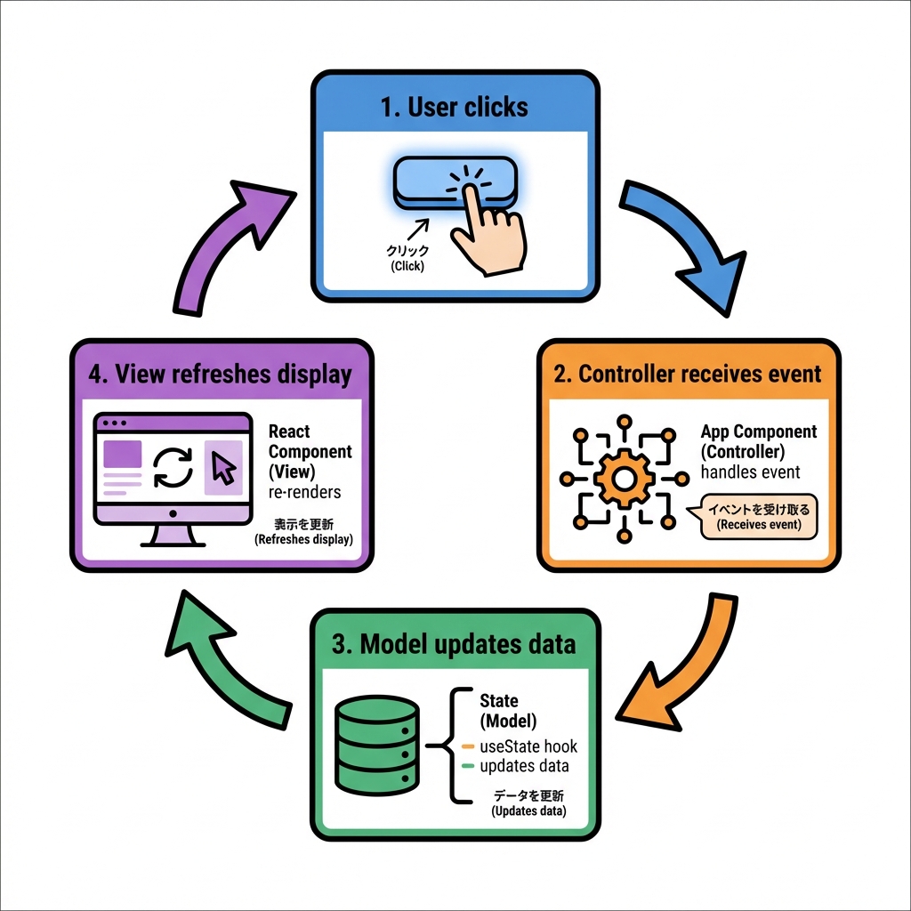 • 「ユーザー操作 → Controller → Model更新 → View再描画」 を毎回同じ形にできる
